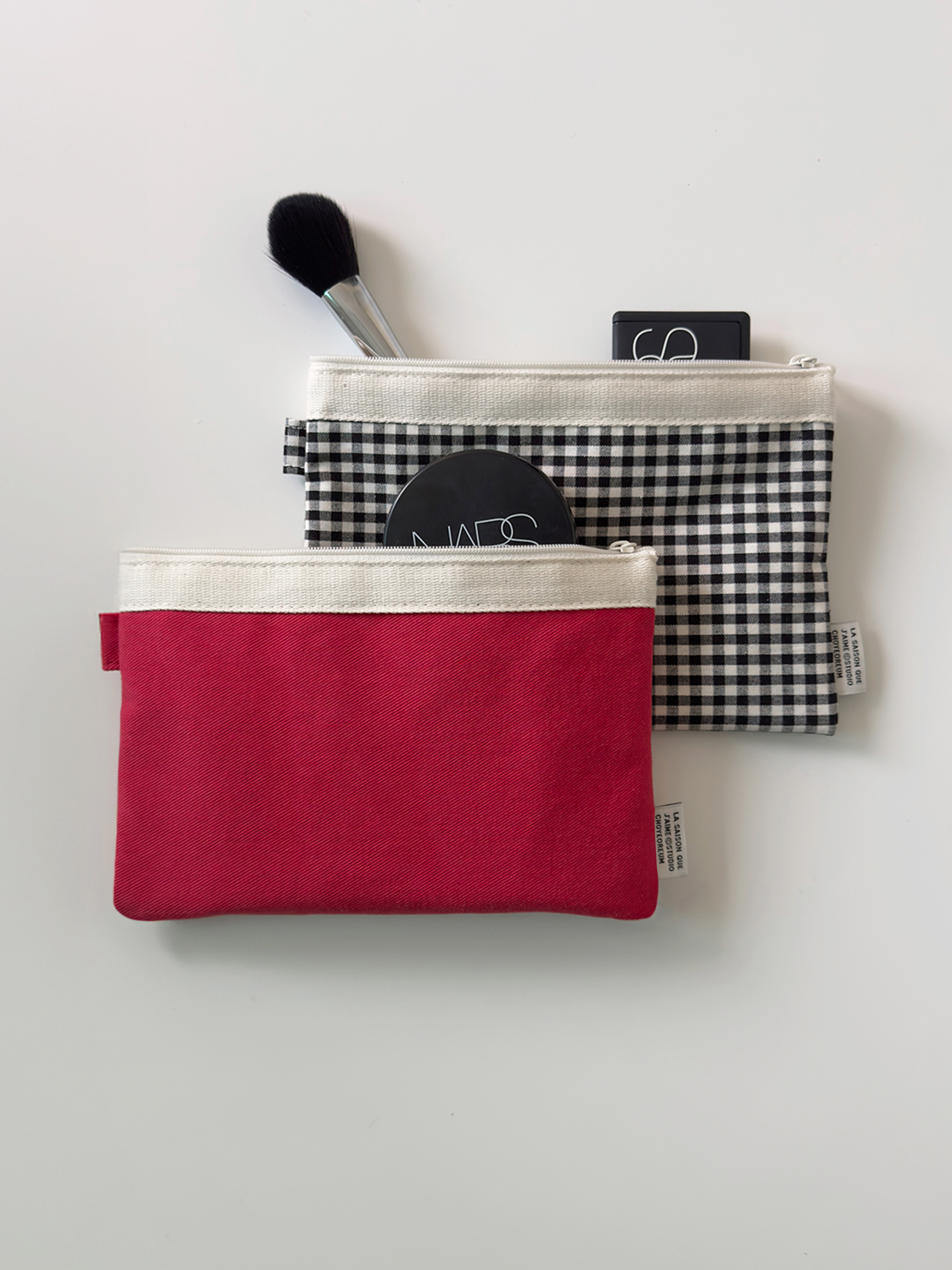 파우치 상단에는 면 끈이 포인트로 더해졌으며 심플한 디자인 속